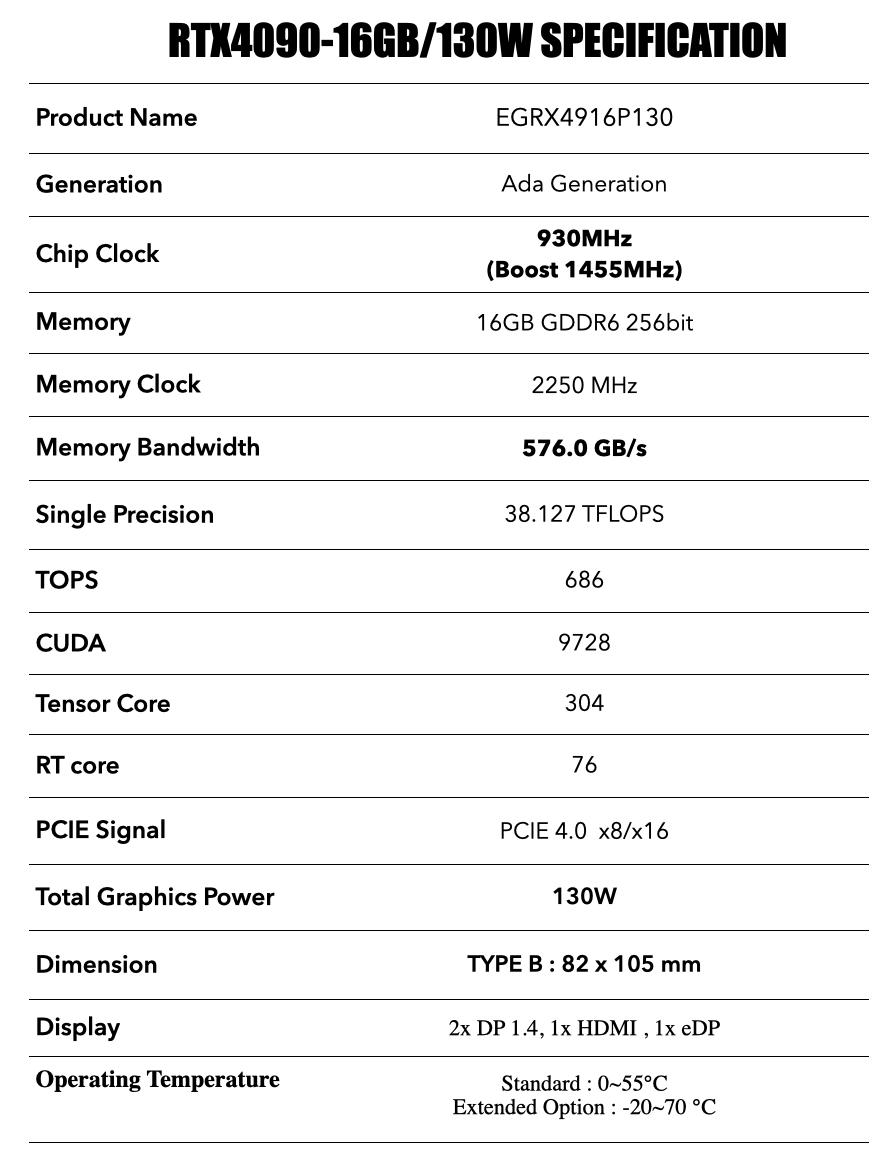 RTX4090/16GB GDDR6 MXM GPU Module for Edge AI computing , 82 x 105 mm with 130W low-power consumption to provide single-precision 38.127 TFLOPS and integer 686 TOPS computing capability.